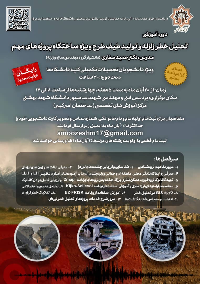 مرکز آموزش های تخصصی دانشگاه شهید بهشتی قصد دارد دوره آموزشی ؛تحلیل خطر زلزله و تولید طیف طرح ویژه ساختگاه پروژه های مهم؛ را جهت علاقه مندان(ویژه دانشجویان تحصیلات تکمیل کلیه دانشگاه ها)  به مدت 30 ساعت و حضوری در محل مرکز آموزش های تخصصی ، ارائه نماید.