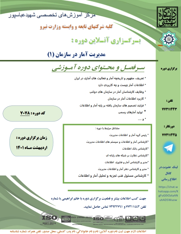 فراخوان بهار دوره" مدیریت آمار در سازمان "1401 ویژه کلیه شرکت های تابعه و وابسته وزارت نیرو *دوره مرتبط با مشاغل مربوط به آمار و فناوری اطلاعات