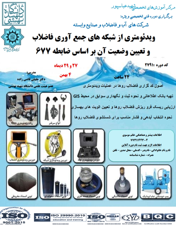 مر کز آموزشهای تخصصی دانشگاه در نظر دارد دوره آموزشی  " ویدئو متری از شبکه های جمع آوری فاضلاب " را برگزار نماید ؛ علاقه مندان به شرکت در این دوره می‌توانند از طریق شماره تماس 73932759 (سرکار خانم موسوی ) نسبت به ثبت نام اقدام نمایند