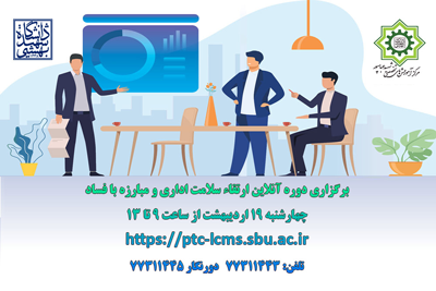 دوره آموزشی «سلامت اداری» از سوی مرکز آموزشهای تخصصی دانشگاه شهید بهشتی برگزار نماید علاقهمندان به شرکت در این دوره میتوانند از طریق شماره تماس 77311444 (جناب آقای اسماعیلی) جهت ثبتنام اقدام نمایند.