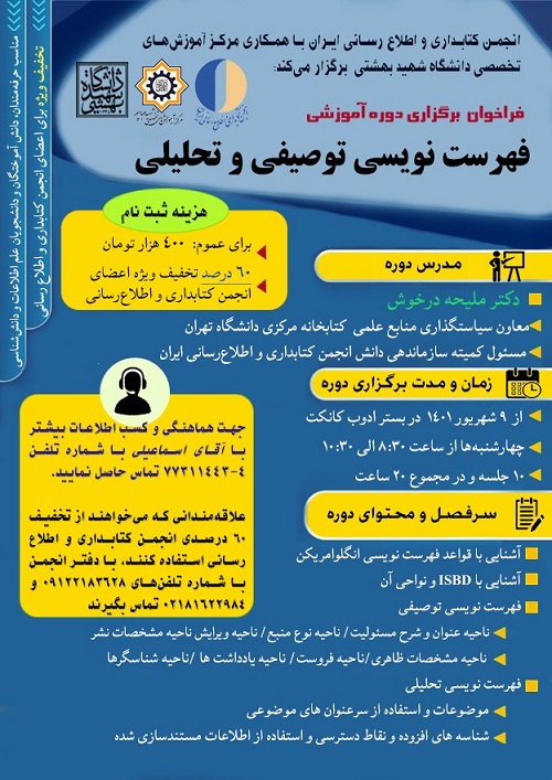 دوره آموزشی «فهرست نویسی توصیفی و تحلیلی» از سوی مر کز آموزش‌های تخصصی دانشگاه شهید بهشتی با همکاری انجمن کتابداری و اطلاع رسانی ایران برگزار می‌شود.