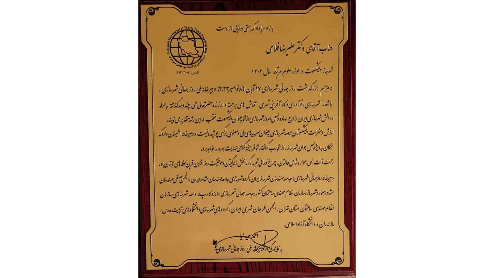 انتخاب دکتر علیرضا فلاحی به عنوان شهرساز پیشکسوت در حوزه علوم مرتبط در سال 1402 توسط دبیرخانه ملی روز جهانی شهرسازی