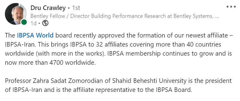 به همت دكتر زمرديان، ايران عضو انجمن بين‌المللی شبيه‌سازى عملكرد ساختمان IBPSA شد