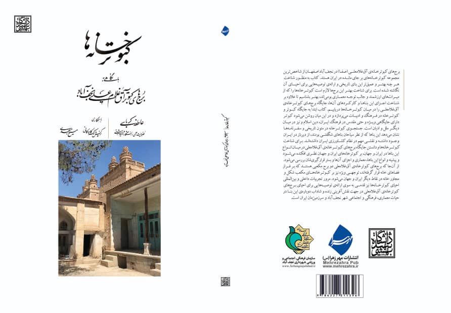در کتاب «کبوترخانه ها» جایگاه برج های تاریخی کبوترخانه به عنوان میراث ارزشمند و برجسته معماری بومی ایران مورد توجه قرار گرفته و به طور خاص به معماری، عناصر و اجزای برج های کبوترخانه ی آق غلامعلی (صفا) در نجف آباد اصفهان، از شاخص ترین مجموعه کبوترخانه های برجای مانده در ایران پرداخته می شود.