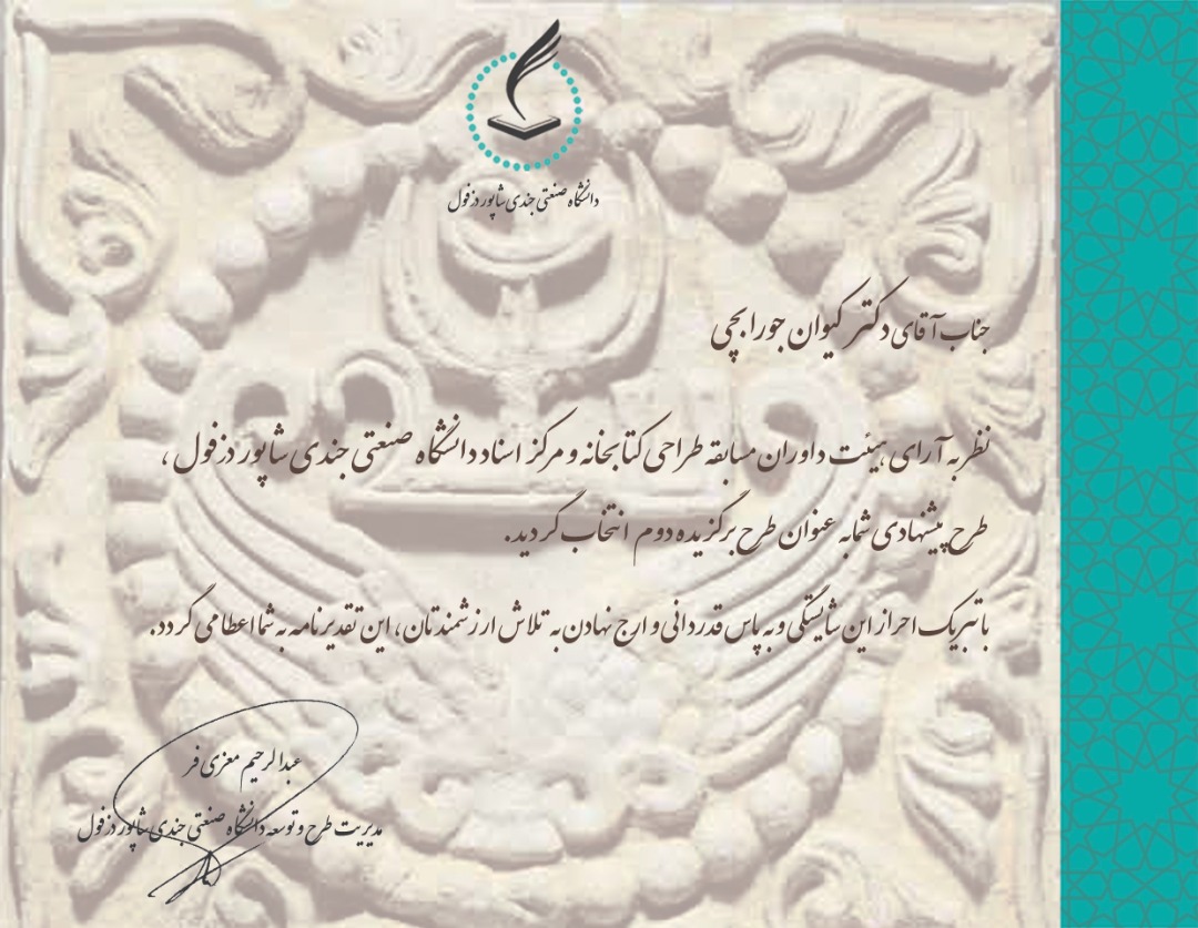طرح پیشنهادی دو عضو هيأت علمى دانشكده معمارى و شهرسازى، دكتر فرهاد شريعت راد و دكتر كيوان جورابچى، در مسابقه ملی طراحى کتابخانه مرکزی و مرکز اسناد دانشگاه صنعتی جندی شاپور دزفول، به عنوان طرح برگزیده دوم انتخاب گردید. اين مسابقه به صورت محدود و به دعوت دانشگاه صنعتی جندی شاپور در بهار سال 1400 برگزار شد.