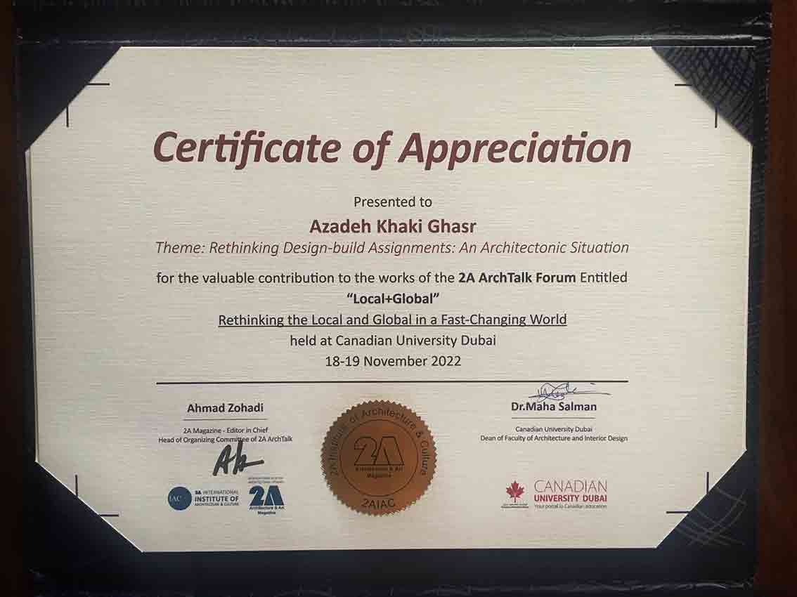 «رقصنده با سایه‌ها» طراحی شده توسط دو تن از اعضای هیات‌علمی گروه معماری، دکتر حسین پورمهدی قائم‌ مقامی و دکتر آزاده خاکی‌قصر، موفق به دریافت رتبه دوم در بخش فضاهای عمومی از جایزه معماری 2A شد. همچنین در نشست‌های کارگاهی - آموزشی که به گفتگو و بحث درباره همراهی "محلی و جهانی"(Global+Local) در معماری می پرداخت و در جریان برگزاری جایزه 2A از سوی دانشگاه کانادایی دوبی روی داد، خانم دکتر خاکی قصر به سخنرانی با عنوان "تاملی در تمرینات طراحی-ساخت" در یکی از پنل های گفتگوی برنامه مذکور پرداختند.