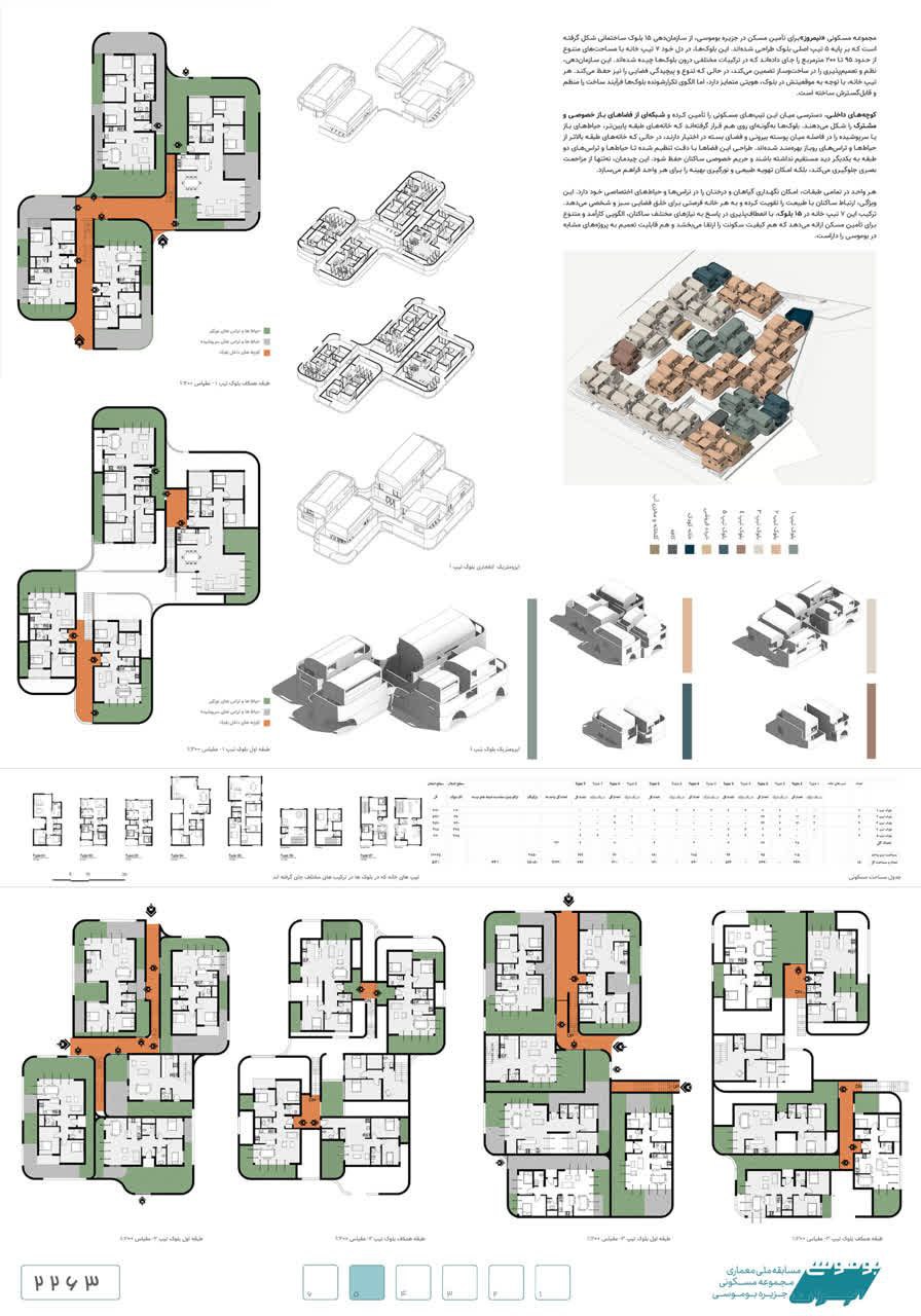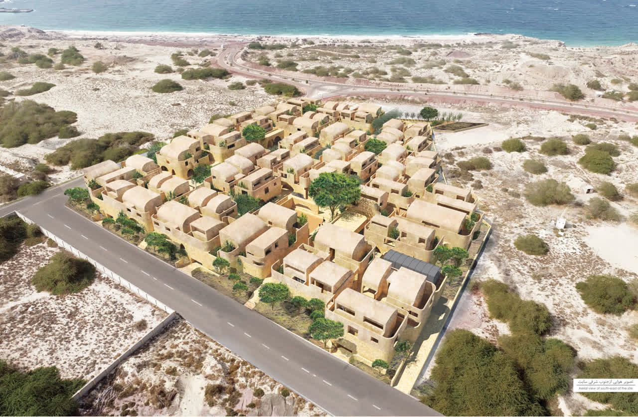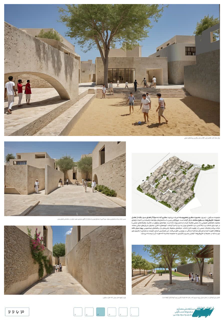 این طرح با نام «مجموعه مسکونی نیمروز»، هویت فرهنگی و اقلیمی منطقه را در قالبی مدرن بازتاب میدهد و با الهام از معماری خلیج فارس، سکونتی پایدار را فراهم کرده و برای تأمین مسکن، از 15 بلوک ساختمانی تشکیل شده که بر پایه 5 تیپ اصلی طراحی شدهاند. این بلوکها شامل 7 تیپ خانه با مساحتهای 95 تا 190 مترمربع هستند که بهصورت متنوع درون بلوکها چیده شدهاند. کوچههای داخلی، دسترسی میان واحدها را فراهم کرده و شبکهای از فضاهای باز خصوصی و مشترک را شکل میدهند. بلوکها طوری روی هم قرار گرفتهاند که خانههای پایینتر حیاطهای باز یا سرپوشیده داشته باشند و طبقات بالاتر از تراسهای روباز بهرهمند شوند. این چیدمان از دید مستقیم میان حیاطها و تراسها جلوگیری کرده، حریم خصوصی را حفظ نموده، ضمن اینکه تهویه و نورگیری بهینه را تضمین میکند. پارکینگها بهصورت جمعی و در حاشیهها قرار گرفتهاند تا پیادهروی و تعاملات اجتماعی در مرکز اولویت داشته باشد.