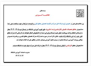 پیرو اطلاعیههای قبلی در خصوص لزوم ارائه اصل مدرک و تأییدیه تحصیلی مقطع قبلی و با توجه به شرایط موجود و در راستای مساعدت به دانشجویان، مقرر شد: