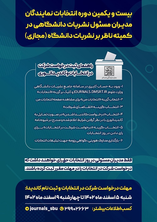 * ثبت نام مدیرمسئول در سامانه جامع نشریات دانشگاهی وزارت علوم https://journals.dmsrt.ir به عنوان شرکت کننده در انتخابات از شنبه 05/12/1402 تا چهارشنبه 09/12/1402
